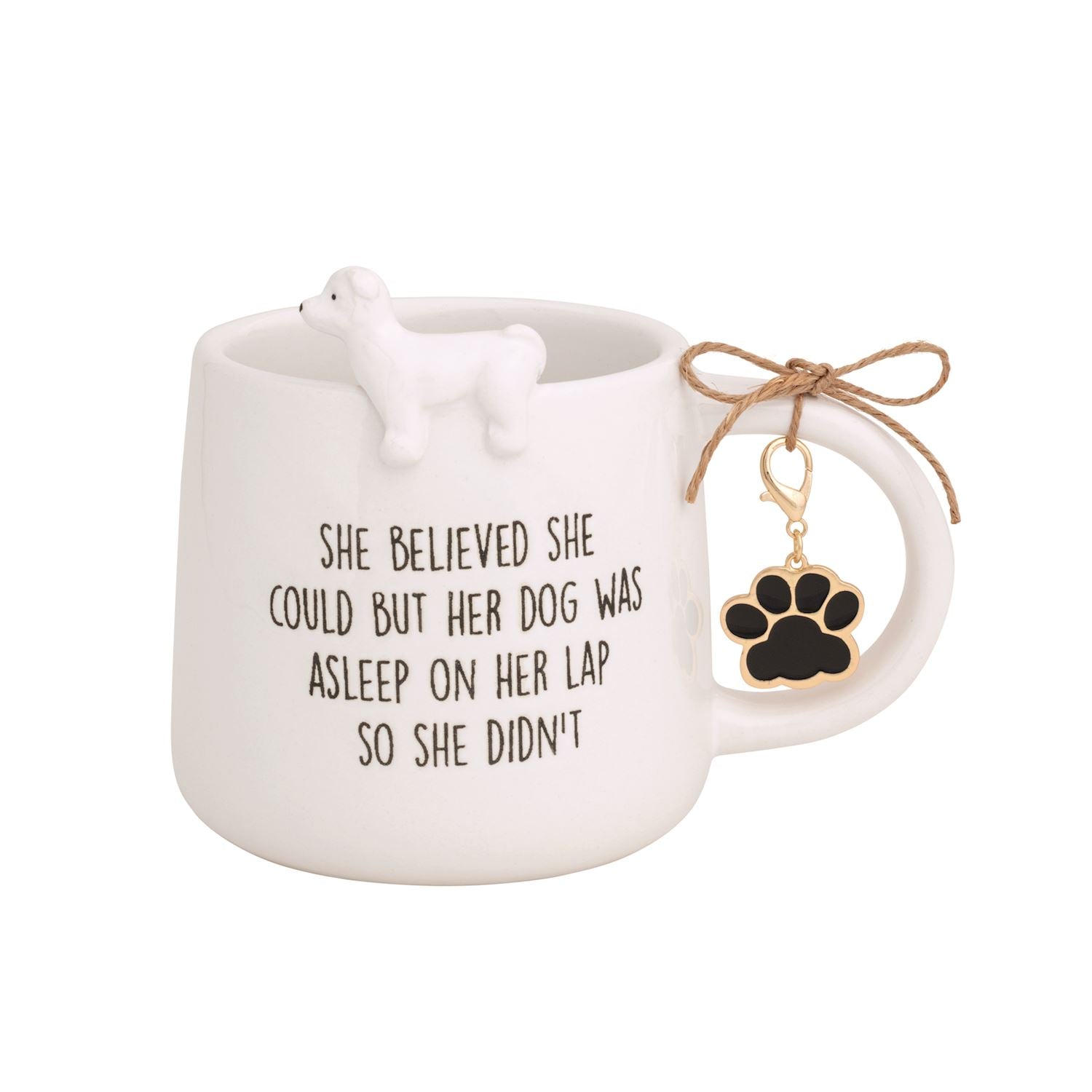 Ceramic mug features hand-painted dog figurine attachment and enamel charm handle.
