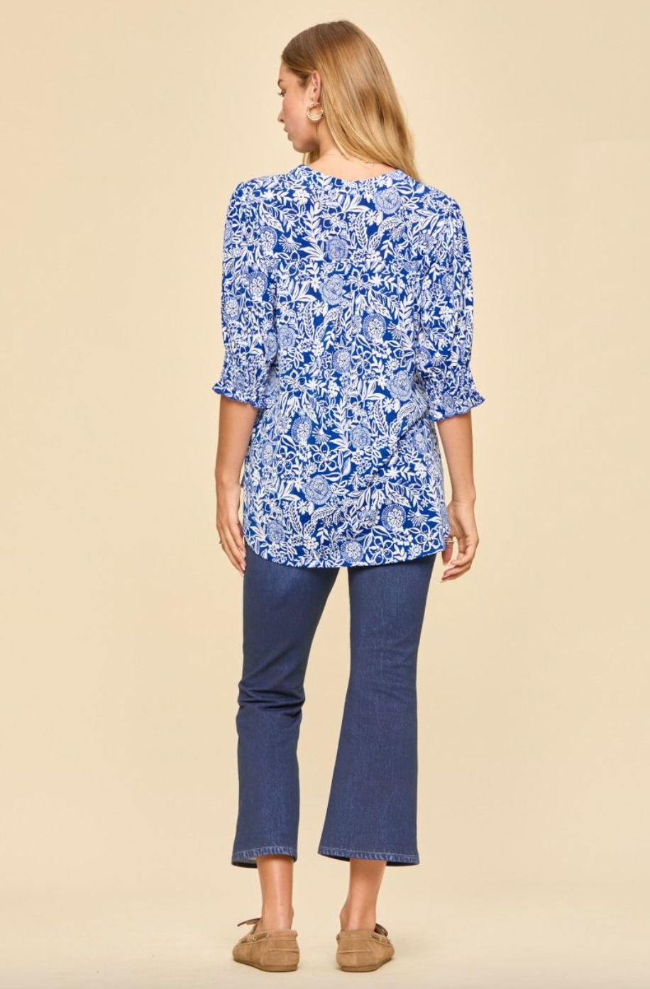 Back by popular demand: the Lizzy Smocked Top. This charming short-sleeve top pairs effortless elegance with everyday comfort. Featuring a mandarin collar, subtly puffed sleeves, and delicate smocked detailing, it offers a feminine, standout look. Made from wrinkle-free fabric, it keeps you polished from morning to night.