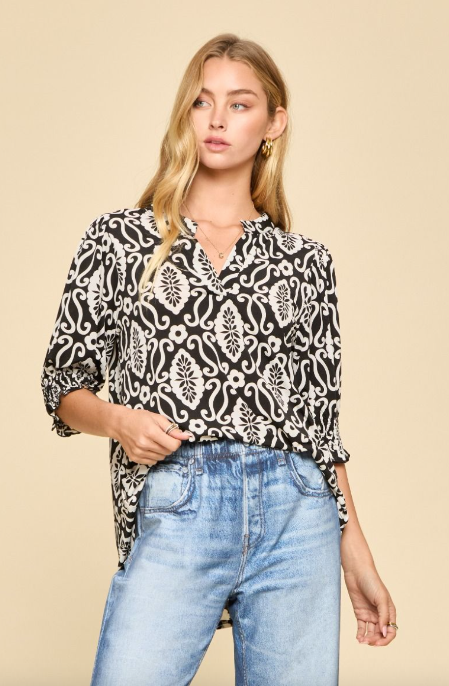 Back by popular demand: the Lizzy Smocked Top. This charming short-sleeve top pairs effortless elegance with everyday comfort. Featuring a mandarin collar, subtly puffed sleeves, and delicate smocked detailing, it offers a feminine, standout look. Made from wrinkle-free fabric, it keeps you polished from morning to night.