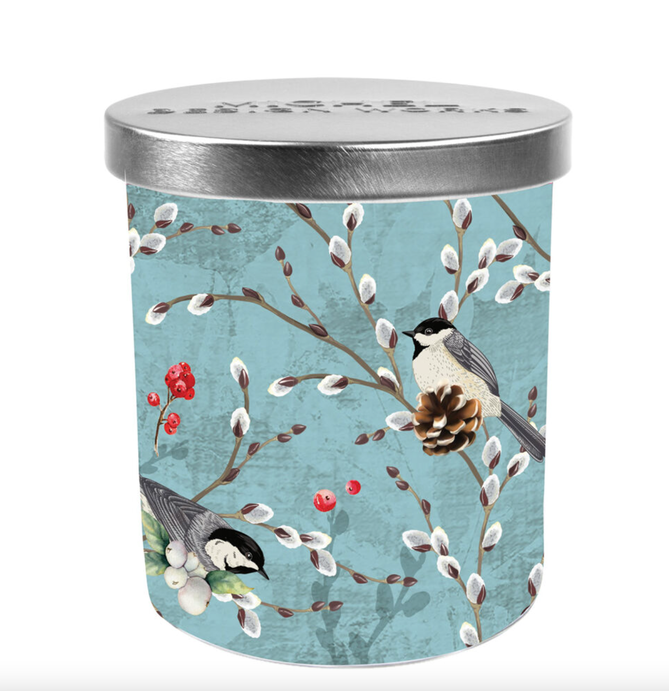 Candle: Evergreen boughs sway softly in the crisp breeze as chickadees flit from branch to branch of nearby pussywillow trees. Featuring beautifully detailed artwork applied directly to the glass, this balsam fir candle is accented by notes of warm sandalwood and lemony thyme. Sure to make a great gift, it’s crafted with a soy wax blend for a luxurious fragrance throw.