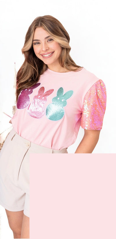 Hop into style with our Bunny Shirt! Featuring 3 adorable bunny patches on the front and playful pink sequin sleeves, this shirt will add a touch of fun to any outfit. Perfect for any springtime celebration, or just showing off your love for bunnies. (Just don't get too hoppy!)