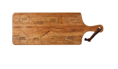 Mango wood paddle board features genuine leather handle loop and engraved surface diagram/guide for building a successful charcuterie board.