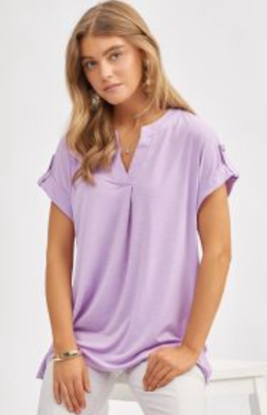This stylish dolman short-sleeve top features a sophisticated mandarin collar adding a touch of elegance to this relaxed silhouette. It's comfortable, easy care, with a laid back vibe. Non sheer, stretchy, wrinkle-free.