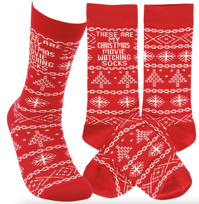 A pair of colorful socks from our Christmas Collection displaying playful hand illustrated designs of Christmas motifs in a knitted style with a humorous seasonal sentiment that reads "These Are My Christmas Movie Watching Socks." These giftable socks are made with a cotton, nylon, and spandex blend for a one size fits most design. Our These Are My Christmas Movie socks come with a decorative header card and a clear plastic hanger for easy rack display and gifting. A funny Christmas gift perfect for seasonal self-expression.
