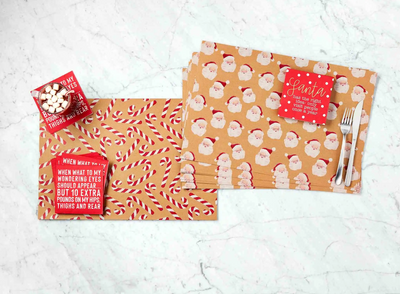 Capture the festive essence of the holidays with our Christmas Placemat Sets. These sets includes 20 Kraft placemats adorned with a delightful santa or candy cane pattern. Each placemat boasts dimensions of 18 1/2" x 12 1/2". Additionally, the set includes 20 paper cocktail napkins measuring 5" x 5", featuring a charming Christmas sentiment. The napkins are elegantly packaged in plastic and secured with a Kraft band on top of the placemats.