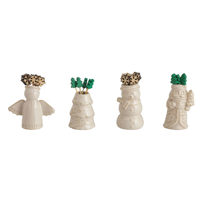 2-piece set. Milk glazed stoneware caddy with textured relief and in mold details. Comes with pack of tree or snowflake topped wooden toothpicks