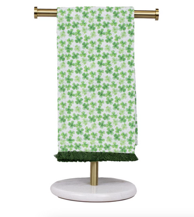 Add a touch of luck to your bathroom with the Clover Hand Towel. Its unique design features a clover towel with a playful green fringe on the bottom. Let this charming hand towel bring a pop of color and a playful vibe to your daily routine.