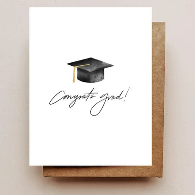 Celebrate your graduate's accomplishments with our Congrats Grad Card! Featuring a graduation cap with the words "Congrats grad!" on the front and a blank inside for your personal message, this card is a perfect way to show your pride and support. Plus, it comes with a kraft envelope for easy gifting.