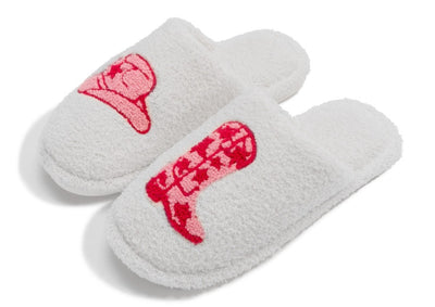 These Cowgirl Slipper Slides are a wild wild west for your feet! Slip 'em on and give your tootsies the perfect little vacation- right at home. Plush cowgirl hat and boot slides will have your feet singing a country tune, 'Yee-hawwww!'