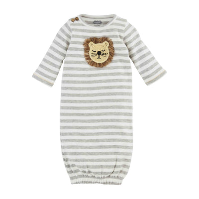 Interlock sleep gown features wood button shoulders and crochet lion applique.
