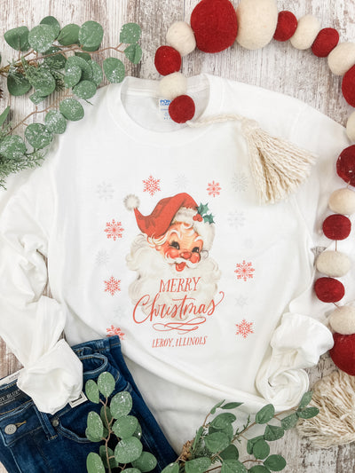 Rock some retro vibes this holiday season with this Customized Vintage Santa Long Sleeve Tee! This unique tee features a vintage Santa image that is certain to make your wardrobe stand out. Plus, it says "Merry Christmas" loud and proud and is available in four different local towns ( LeRoy, Downs, Bloomington and Normal)! Whether you're throwing a holiday party or caroling with friends, this long sleeve tee makes sure you stay comfy and stylish all season. Ready, set, holly jolly!