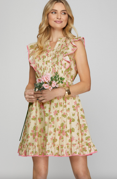 Upgrade your wardrobe with the Eva Flutter Sleeve Woven Dress. This stylish dress features flutter sleeves and a vibrant floral pattern, perfect for any occasion. The knee-length cut and elastic waist ensure a flattering fit, while pockets and piping add functionality and style to this must-have piece.