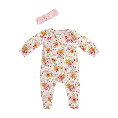 2-piece set. Knit bamboo footed sleeper. Comes with bow headband.