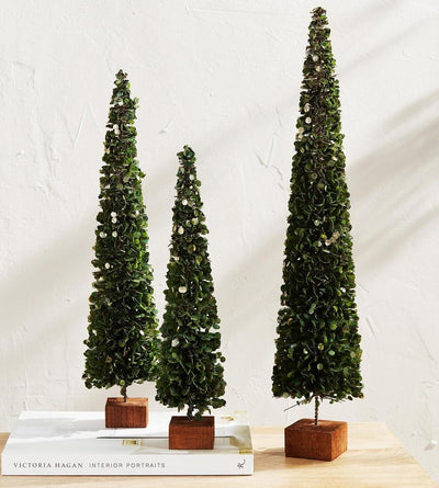 This small faux boxwood tree has glitter accents and wood block base. A holiday harvest botanical that can be used as year-round Decor.