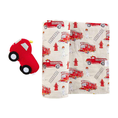 2-piece set. Muslin swaddle blanket. Comes with sweater knit rattle.