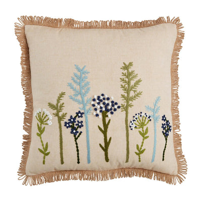 Cotton slub pillow features French knot embroidery and jute loop trim.