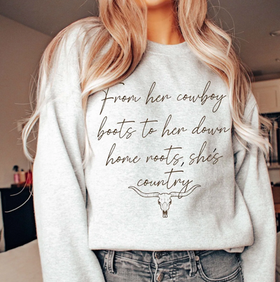 Embrace the cozy comfort and undeniable charm of Western culture with our "From Her Cowboy Boots" Sweatshirt. This piece perfectly blends the warmth of a sweatshirt with the iconic style of cowboy boots, making it a must-have for anyone who loves the rugged elegance of the West.