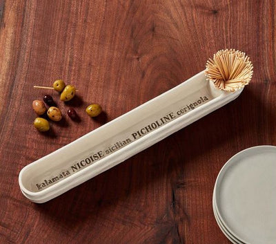 2-piece set. Stoneware olive boat with debossed olive varieties features integral toothpick well. Arrives with one pack of toothpicks.