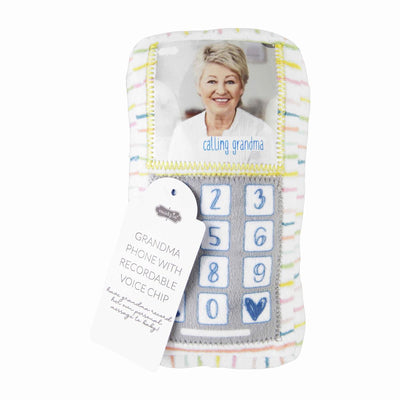 Plush Minky plays phone features a vinyl photo sleeve for Grandma's picture and a recording sound chip for her to record her own personal message to baby.