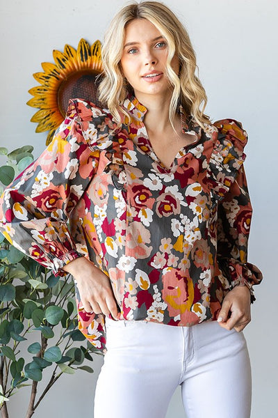 Introducing our Floral Print Relaxed Fit Blouse, designed for the woman who values elegance and sophistication. Featuring a delicate ruffled V neckline, ruffle elastic cuff long sleeves, and ruffled shoulders, this blouse is a work of art. Its relaxed fit ensures both comfort and style, making it the perfect addition to your wardrobe.