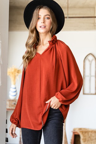 Solid Airflow Polyester Bubble Long Sleeve With Ruffle Neck Detail Top