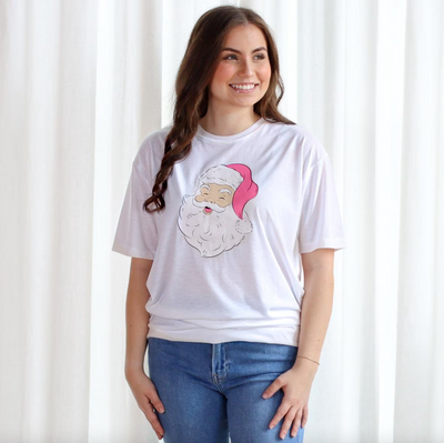 Let Santa wrap you in style with our Ho Ho Ho Santa Tee! This quirky tee features a jolly Santa head wearing a pink hat, perfect for spreading holiday cheer. Stay festive and fashionable this season with our playful Santa tee.