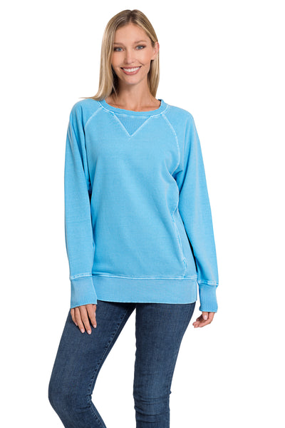 Be bold in this Iris Pigment Dyed Pullover, crafted with 100% Cotton French Terry. It's equipped with pockets and ribbed detail, perfect for taking big risks in style. Step up to any challenge with confidence and comfort!