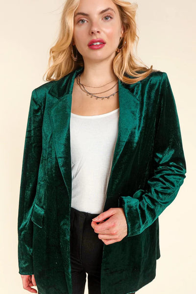 This Ivy Velvet Blazer adds a luxurious touch to any formal look. Crafted from fine hunter green velvet, the collar and lapel pocket give it an air of sophistication and exclusivity. Perfect for adding a subtle hint of class and elegance to any outfit.