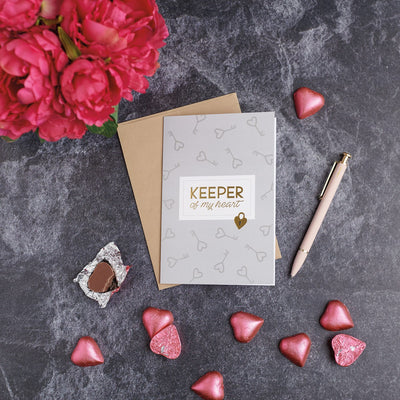 A charming greeting card displaying a heart shaped lock and keys design with digitally embossed sentiment and gold foil accents that create a shiny texture you can feel. The front of the card features "Keeper Of My Heart" sentiment with a blank space inside to create a personalized message.