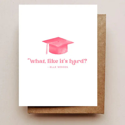 Congratulate your favorite grad with our Legally Blonde Graduation Card. Featuring the iconic quote "What, like it's hard?" from the beloved movie, this card is sure to bring a smile to their face. With a blank inside for your personal message and a kraft envelope included, it's the perfect card for any Elle Woods fan. Get your bend and snap ready!