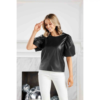 Our Lemy Black Faux Leather Top is a must-have piece for those who want to make a lasting impression. This stylish top boasts a trendy faux leather material that exudes confidence and sophistication. With its puff short sleeves and alluring keyhole detail at the center back, this top effortlessly combines fashion-forward design with timeless appeal. Crafted from high-quality 100% polyester with a polyurethane coating, it ensures both durability and comfort. Measuring approximately 24" from shoulder to hem (size small), this versatile top is perfect for various occasions. When it comes to care, simply hand wash it on cold and lay it flat to dry.