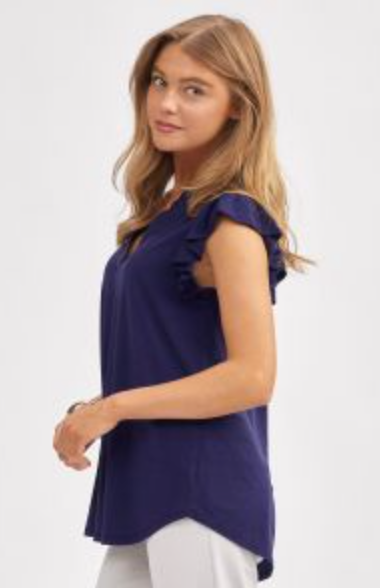Lizzy flutter tank features a classic mandarin collar and pleated detail on the back. We love the flattering silhouette this top offers! Relaxed, knit, stretchy.