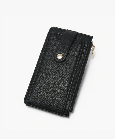 The Mae Multi-Card Wallet is designed for both style and practicality, crafted from sleek vegan leather. Featuring a strap snap closure, this wallet includes multiple card slots, a clear ID window, and both top and back zip closures for secure storage. The compact design makes it a perfect choice for on-the-go organization.