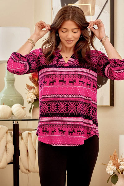 Our signature lizzy top features poly blend which features luxurious softness with lightweight, wrinkle free comfort. This easy care fabric top is travel friendly, cooler than linen and other materials which makes your perfect ON THE GO wear. Lizzy top also features china collar neckline with 3/4" length sleeves with tab details. The fit is relaxed, flowy fit with slight high low.