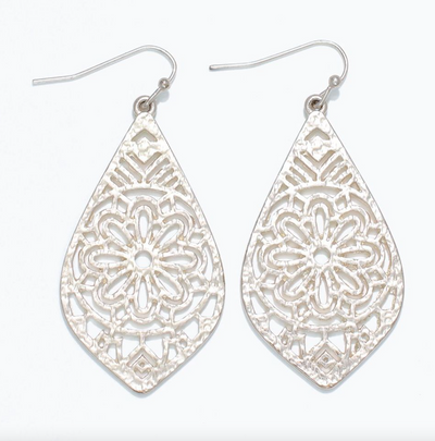 These matte silver earrings feature intricate lace-like cutouts that highlight expert craftsmanship and delicate design. Their subtle finish and detailed patterns provide a sophisticated accessory, perfect for adding refined elegance to any look. Ideal for those who appreciate understated artistry and timeless style.