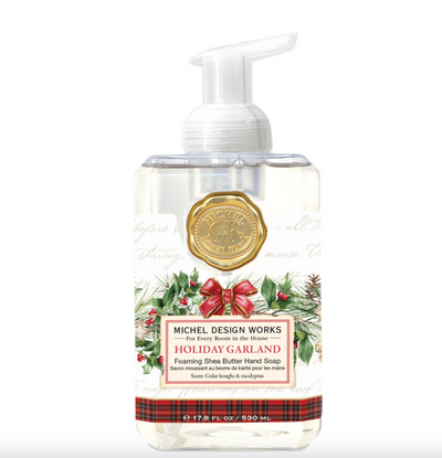 Deck the halls: festive greenery, beautiful bows, and shiny gold bells create a very merry scene. Featuring premium ingredients like shea butter and aloe vera, this holiday foaming hand soap gently cleanses and moisturizes while leaving hands lightly scented with notes of cedar boughs intertwined with sprigs of eucalyptus, pine, and berries. Generously sized, the attractive dispenser fits perfectly in our hand care caddies for an elegant sink companion.