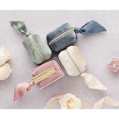 Our Velvet Minimergency Kits for Bridesmaids with matching scarf pulls contains 21 essentials: Hair spray, compact mirror, cotton swabs, emery board, earring backs, clear elastics, mending kit, safety pin, double-sided tape, stain remover, extra buttons, deodorant towelette, pain reliever, breath drops, dental floss, adhesive bandage, facial tissue, blotting tissues, bobby pins, antacid and extra wedding bands.