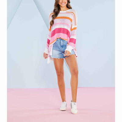 Indulge in luxury with our Montana Sweater. This thin gauge ribboned knit sweater boasts chic balloon sleeves and a custom stripe pattern. Its versatile one size fits most design adds effortless sophistication to any outfit. Elevate your wardrobe and make a statement with this piece.