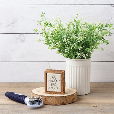 A wooden box sign mini featuring a hand lettered "My Kids Have Paws" sentiment and tile-like enamel finish for added appeal.