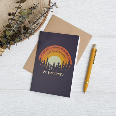 a sun behind trees using metallic ink that adds shine to the design. The front of the card features sentiment that reads "Those With Compassionate Hearts Are Often Needed Most In Heaven" with a blank space inside to create a personalized message.