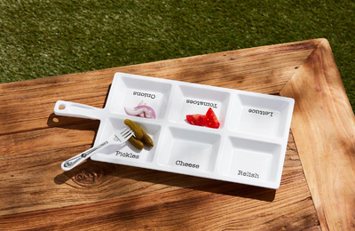 2-piece set. Sectioned shatterproof melamine paddle board. Comes with melamine fork.