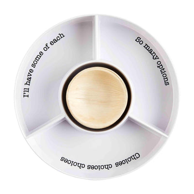 Four-section ribbed melamine server features center well to hold four included eco-friendly, microwave safe, palm leaf plates.