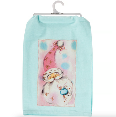 A cotton kitchen towel from our Christmas Collection displaying a retro pastel inspired design of Santa on a pastel blue towel with glitter accents and stitching border. Our Pastel Santa kitchen towel is conveniently machine-washable for easy cleaning. Seasonal kitchen towel is packaged on a clear plastic hanger to easily display on rack. A retro pastel Christmas kitchen accessory perfect for seasonal use.