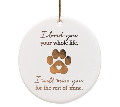 White ceramic disc ornament with a gold decal design in the center. The message around the paw is "I loved you your whole life. I will miss you for the rest of mine".