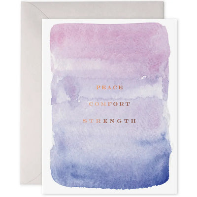 This condolence card offers a simple yet powerful message of "Peace Comfort Strength." Blank inside, it provides space for a personalized message to convey sympathy and support. Let this card provide comfort for those who are grieving.