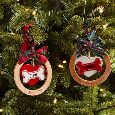 Add your furry friend to your Christmas tree with our Top Dog ring ornament. The wood ring ornament features a ceramic center pendant and tartan bow. The edge of the ornament reads "Top Dog". The ceramic white bone in the center can be personalized with permanent marker to show your pup's name.