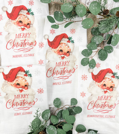 Gift something truly special this holiday season with our Personalized Santa Tea Towels. Emblazoned with your personal town details, a festive Santa, and a cheery "Merry Christmas" greeting, these tea towels make a luxurious addition to any kitchen and a unique gift your loved one can cherish for years to come. Capture the spirit of the holiday season with this exquisite piece.