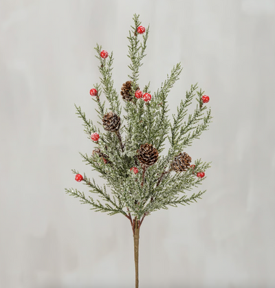 A pick featuring berries and pinecones with a mica coating for a snowy effect.