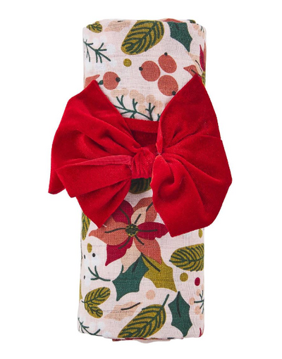 Our Poinsettia Swaddle and Headband Set is so special. The two piece set comes with a muslin swaddle blanket. The swaddle blanket features an adorable poinsettia pattern with pops of pink, red and green. The swaddle blanket also comes with a red stretch velvet bow headband.