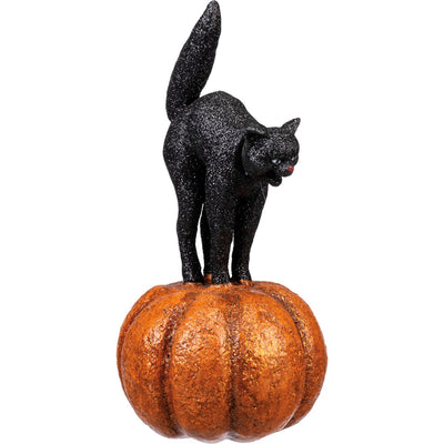 A black cat figurine standing on a pumpkin that's perfect for fall.